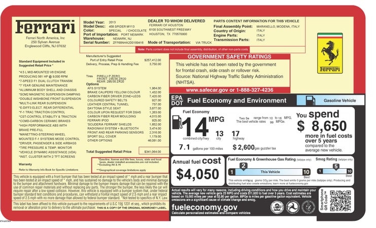 201334,882 mi458 Spider$234,900exterior colorExtra Sampleinterior colorCioccolato Available atFerrari of San Diego